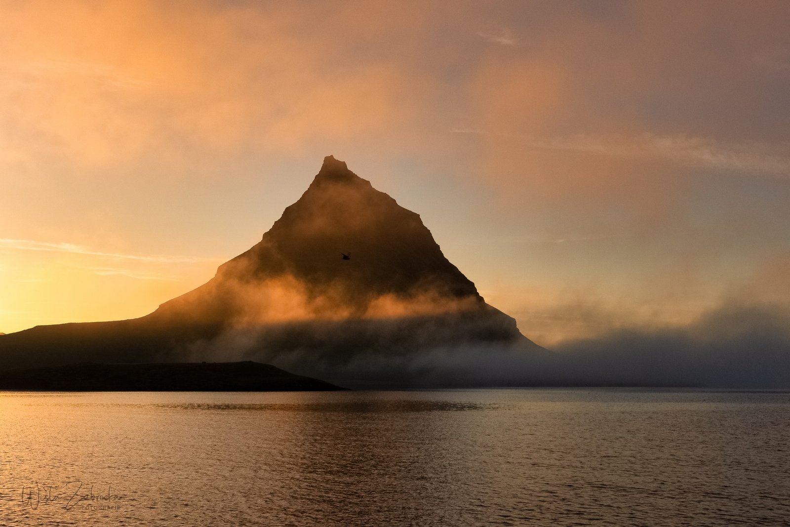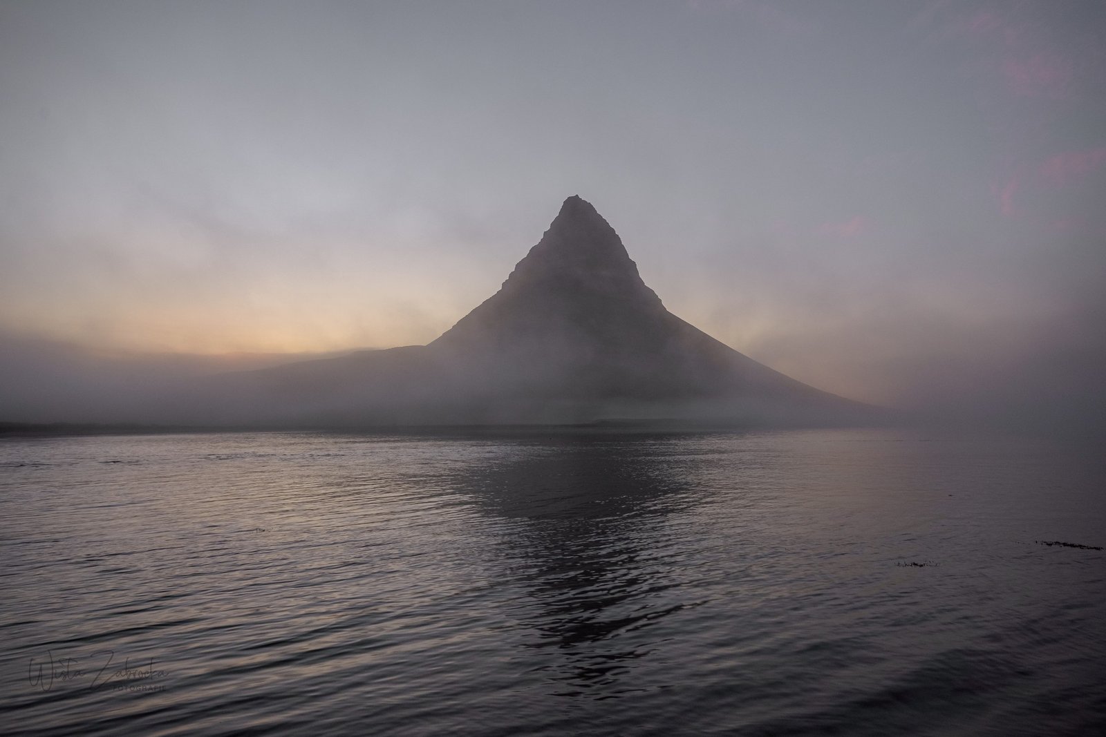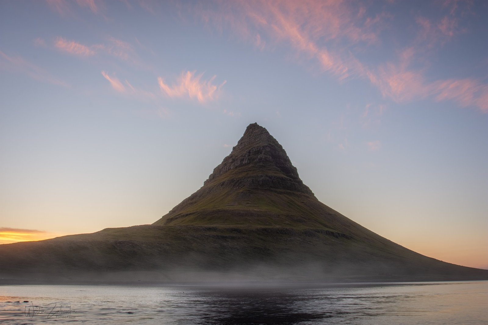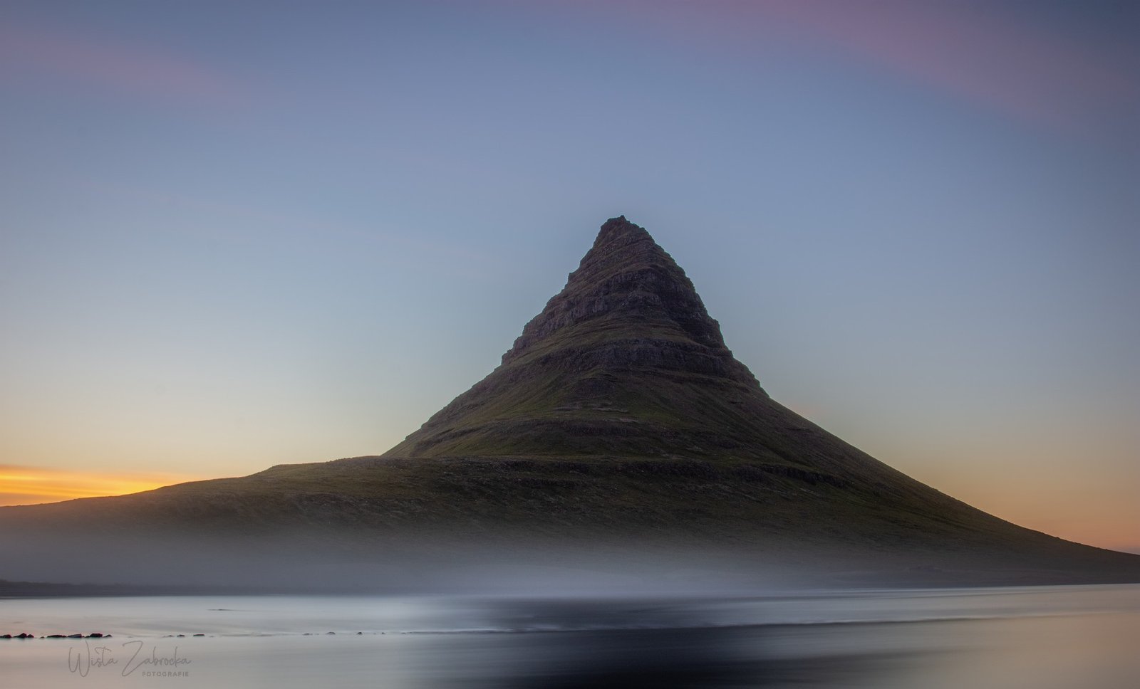 Warto było czekać. Po zachodzie niebo nad Kirkjufellem wypogodniało. Na nocnym błękicie pojawiły się różowe chmurki a mgiełka snuła się tuż przy powierzchni ziemi.